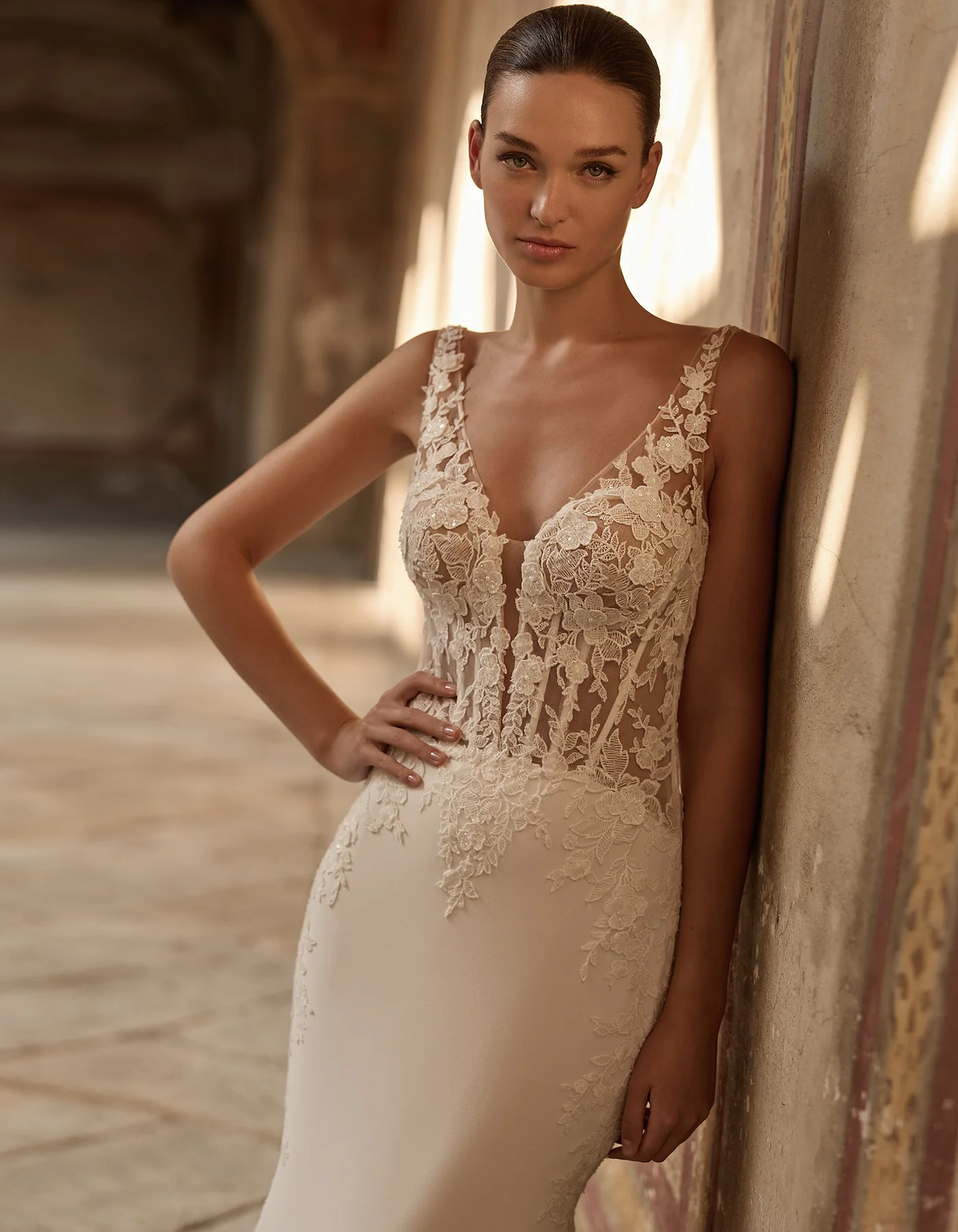 Robe de mariée sirène moderne combinant un corsage structuré avec applications de dentelle et une jupe en crêpe. Des insertions de dentelle et de transparence au dos créent une traîne délicate. Manches volumineuses amovibles incluses.